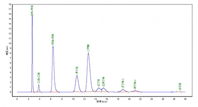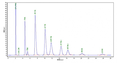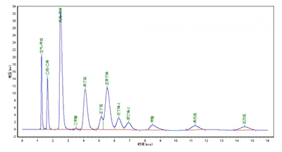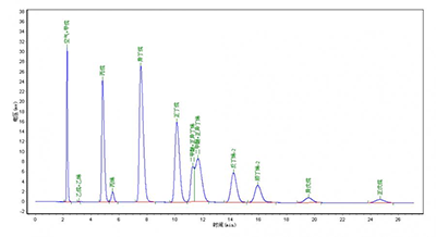 液化氣C5以下氣態(tài)烴類組成,不包括炔烴,用帶有熱導檢測器的氣相色譜儀,由色譜柱將試樣中各組分分離,面積歸一法或校正面積歸一法定量各組分百分含量。