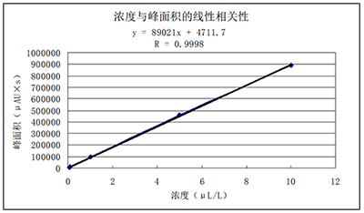 配制濃度分別為:0.05μL/L,0.1μL/L,1μg/mL,5μL/L,10μL/的糠醛標(biāo)樣溶液,依次進(jìn)樣檢測,測得R=0.9998,線性方程為y = 89021x +4711.7,在0.05μL/L~10μL/L范圍內(nèi)線性良好。